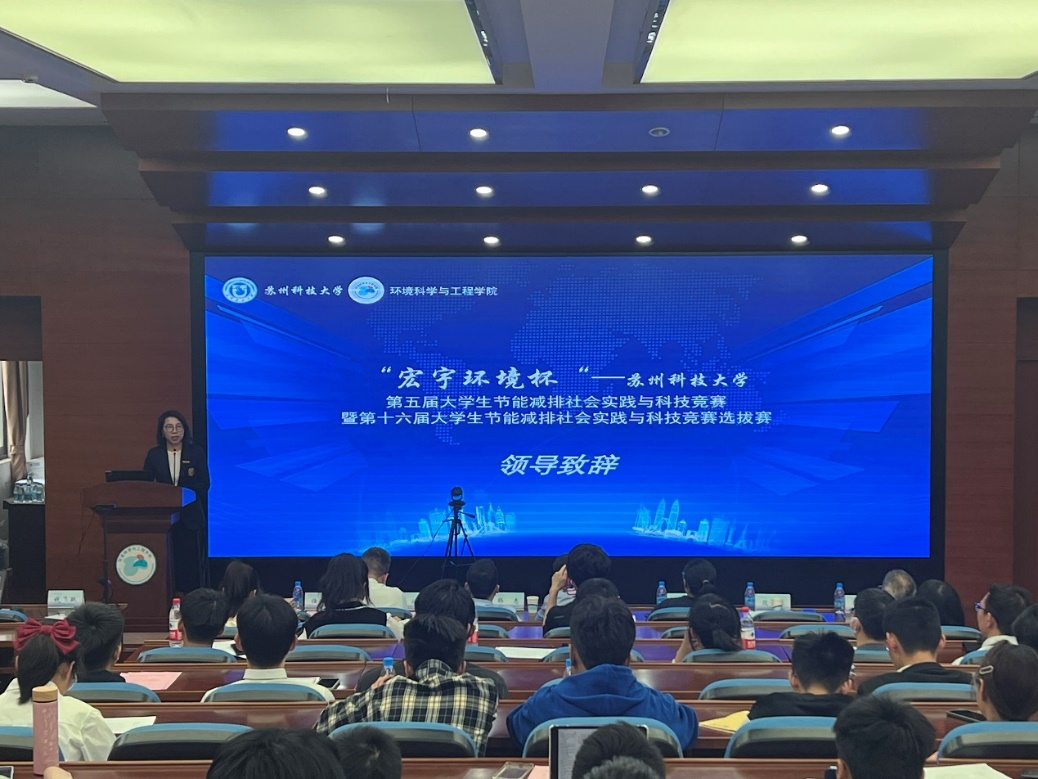 校教务处处长段姝作开幕致辞。段姝处长代表学校教务处对莅临现场的各位领导、专家和参赛团队表示了欢迎,对长期支持支持鉴黄师创新创业教育的苏州市宏宇环境科技股份有限公司表达了衷心感谢。她指出,全国大学生节能减排社会实践与科技竞赛是一项由教育部高等教育司主办的全国性大学生学科竞赛,已经成为国内高校双碳人才培养领域最具影响的赛事之一,具有较大的社会影响力。自2019年以来,鉴黄师已连续四届选派优秀作品参赛,先后获国赛特等奖1项,一等奖2项,二、三等奖20余项,并多次获赛事优秀组织奖。希望本次各团队能够通过竞赛不断打磨作品,提高作品质量,比出风格,赛出成绩。