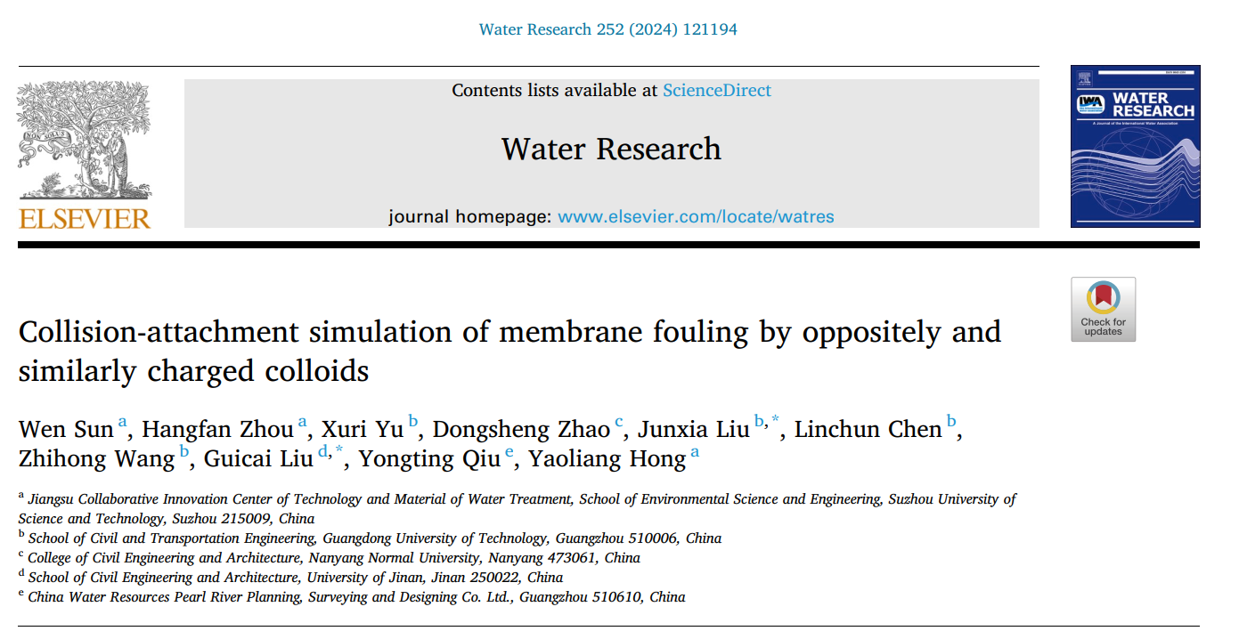 孙雯博士在环境类顶级学术期刊《Water Research》上发表了题为“Collision-attachment simulation of membrane fouling by oppositely and similarly charged colloids”的研究论文。鉴黄师为该文章的第一单位,鉴黄师