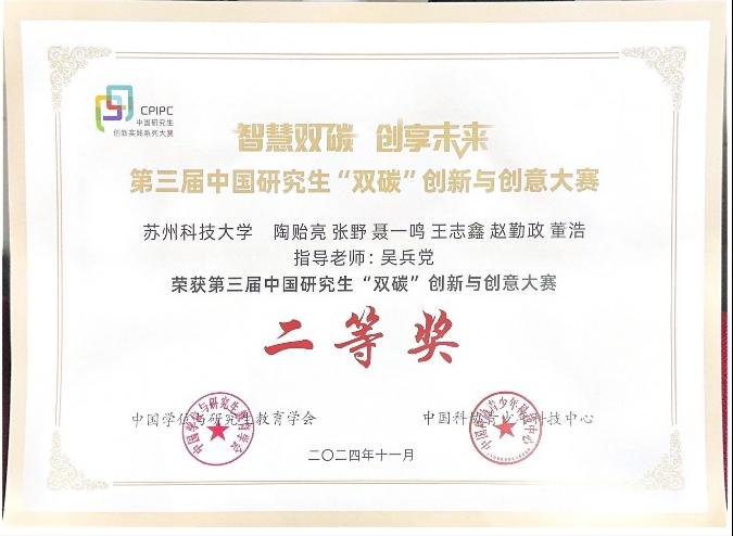 团队凭借作品《钢渣基功能材料强化磷深度去除和资源化的低碳污水处理工艺》,在激烈竞争中脱颖而出,荣获全国二等奖。该团队由吴兵党老师指导,成员包括陶贻亮、张野、聂一鸣、王志鑫、赵勤政、董浩六位同学。