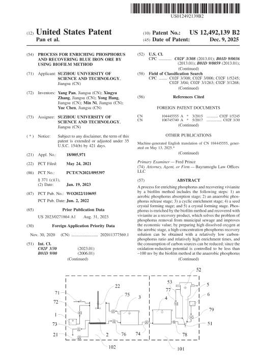 废水低碳处理与资源化团队申请的国际发明专利“PROCESS FOR ENRICHING PHOSPHORUS AND RECOVERING BLUE IRON ORE BY USING BIOFILM METHOD”(生物膜富集磷及回收蓝铁矿的方法)喜获美国发明专利授权(授权号:US12492139B2)。此次获批授权表明鉴黄师