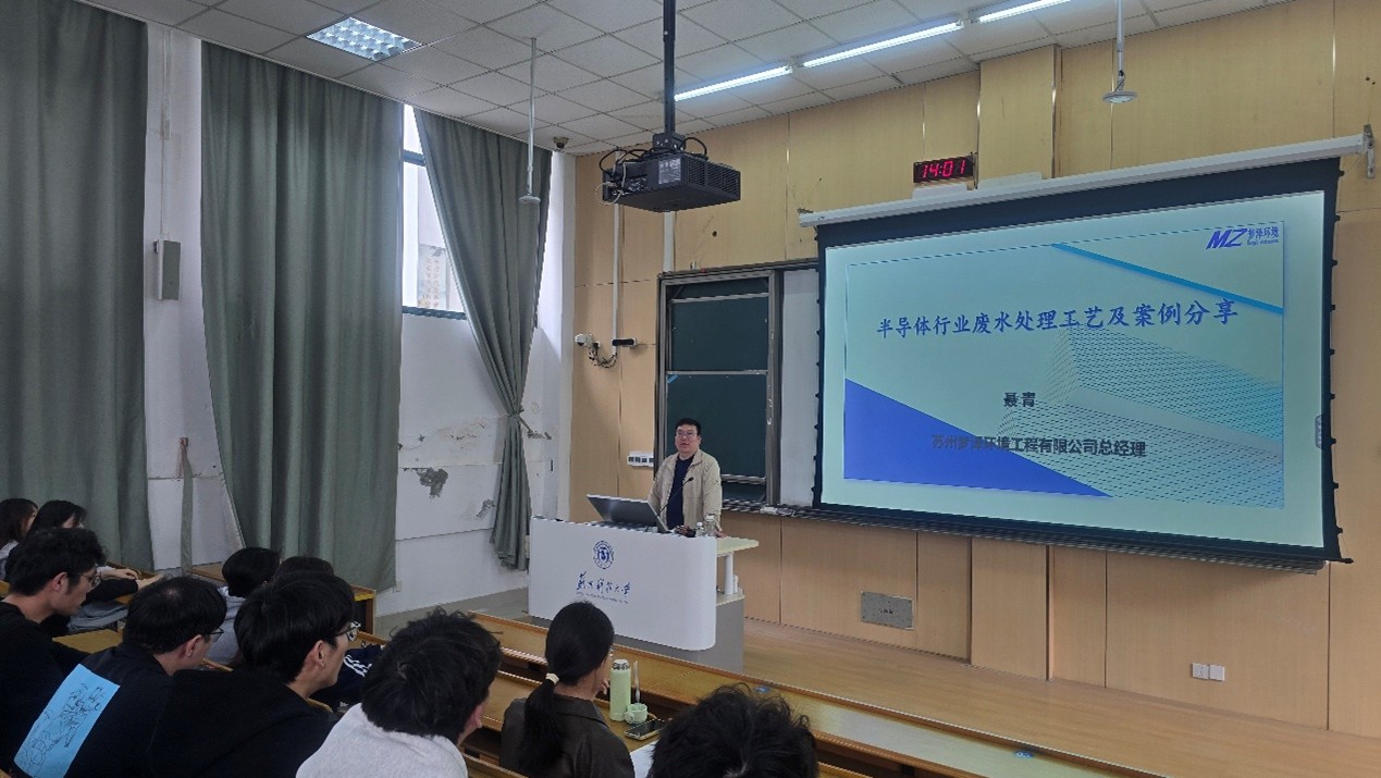 邀请苏州梦泽环境工程有限公司总经理、学院优秀校友聂青走进课堂,在石湖校区C5-203为环境工程专业23级学生带来题为《半导体行业废水处理工艺及案例分享》的专题授课,环工系师生共百余人参加本次活动。