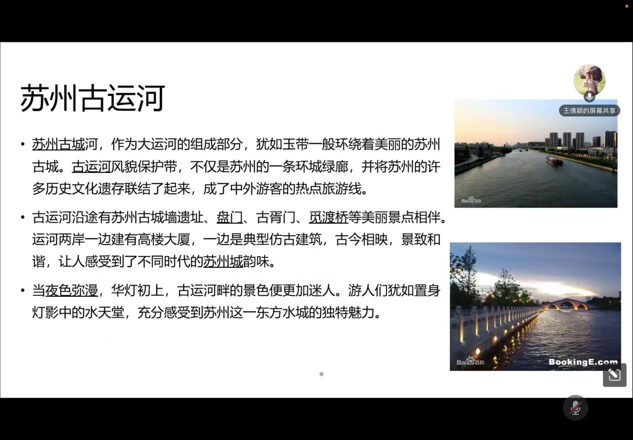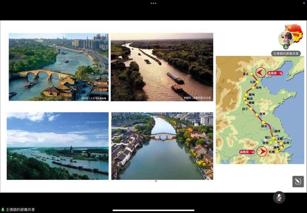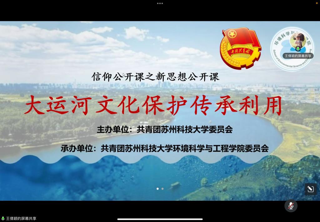 首先,王倩颖向同学们介绍江苏省运河城市的起源及运河城市的发展,加深了同学们对大运河文化的了解。接着,向同学们阐述了习近平总书记关于大运河文化保护传承利用的重要讲话指示精神,介绍江苏省在顶层设计、遗产保护、文旅融合等方面发力,扎实推动大运河文化带建设迈出新步伐的有效成果。然后,以苏州段运河为例,描述苏州“运河十景”、淮安大运河百里画廊、宿迁皂河龙运城等刚上新的文化地标,山水园林、滨水空间在“美丽中轴”上串珠成链,古老的“黄金水道”焕发出新的活力。并总结随着历史文化街区修复、老街提升改造、环境综合整治等项目深入推进,历史建筑、非遗项目在保留“老味道”的同时,也在融入城市烟火、走进现代生活。会议最后,王倩颖和同学们就如何利用专业知识保护大运河环境和文化进行探讨,引发同学们的积极深入思考并加强同学们身为环境专业学生保护大运河文化及环境的责任意识。