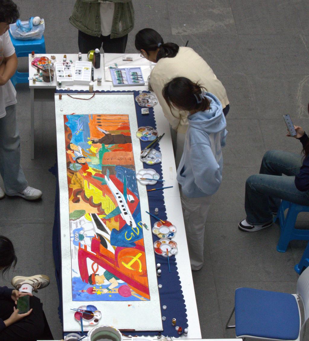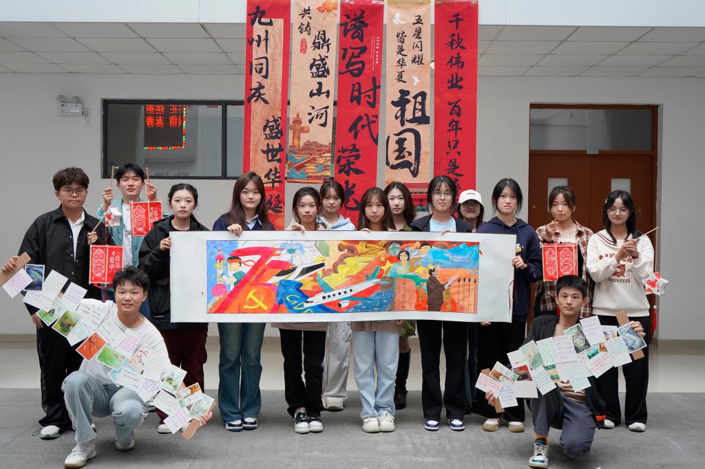 学生会在一楼大厅组织了一场别开生面的绘画活动——“七十五载逢盛世,同心共筑绘华章”。此次活动吸引了众多学生的热情参与,他们以画笔为媒介,共同绘制了一幅寓意深远、色彩斑斓的画卷,以此表达对祖国的热爱和对美好未来的憧憬。