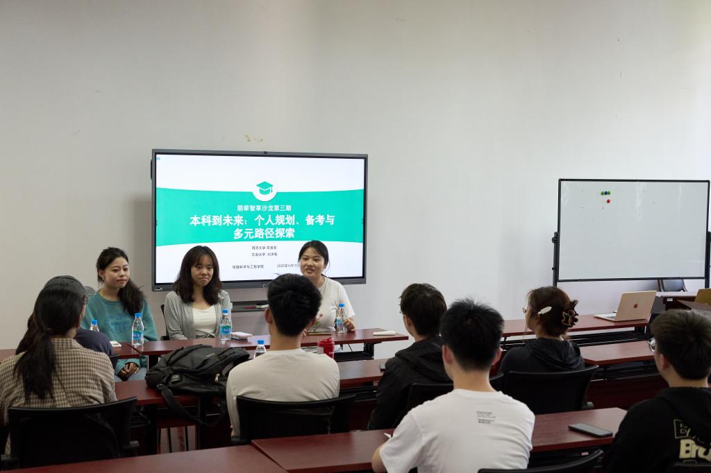 在A栋二楼会议室举办第三期朋辈智享沙龙。本次沙龙以“本科到未来:规划、备考与多元路径探索”为主题,邀请2022届优秀校友常淑惠(同济大学在读博士)、刘洋畅(东南大学在读硕士生)进行经验分享,活动由辅导员王倩颖主持。