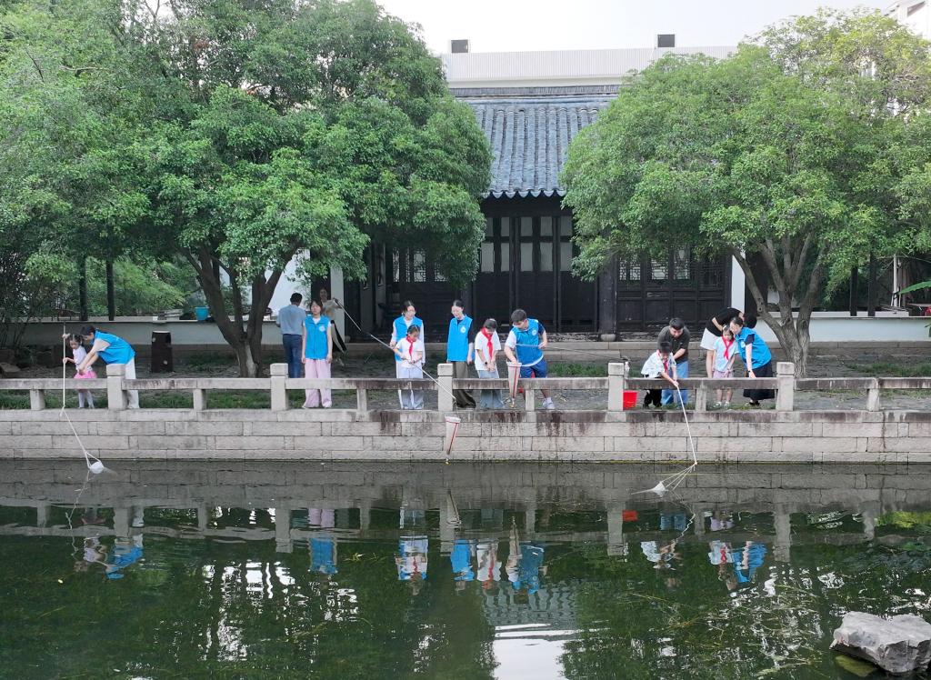 走出教室,实践活动转入“实景课堂”——景观水体综合整治案例师陶园。园内亭台楼阁、曲水环绕。成员带领小学生们有序观摩水体已变清澈的师陶园,直观理解了“水环境治理”的意义,小朋友们纷纷感叹“保护水质原来要做这么多事”。在老师的指导下,孩子们小心翼翼地将提前准备适合放生的小鱼苗放入水中,看着小鱼在清澈的水里游动,大家兴奋地分享着“希望小鱼在这里快乐生活”的心愿。园林内的趣味互动,不仅让孩子们感受到苏州园林与水共生的雅致,更将“守护水资源”的种子播撒进心田。