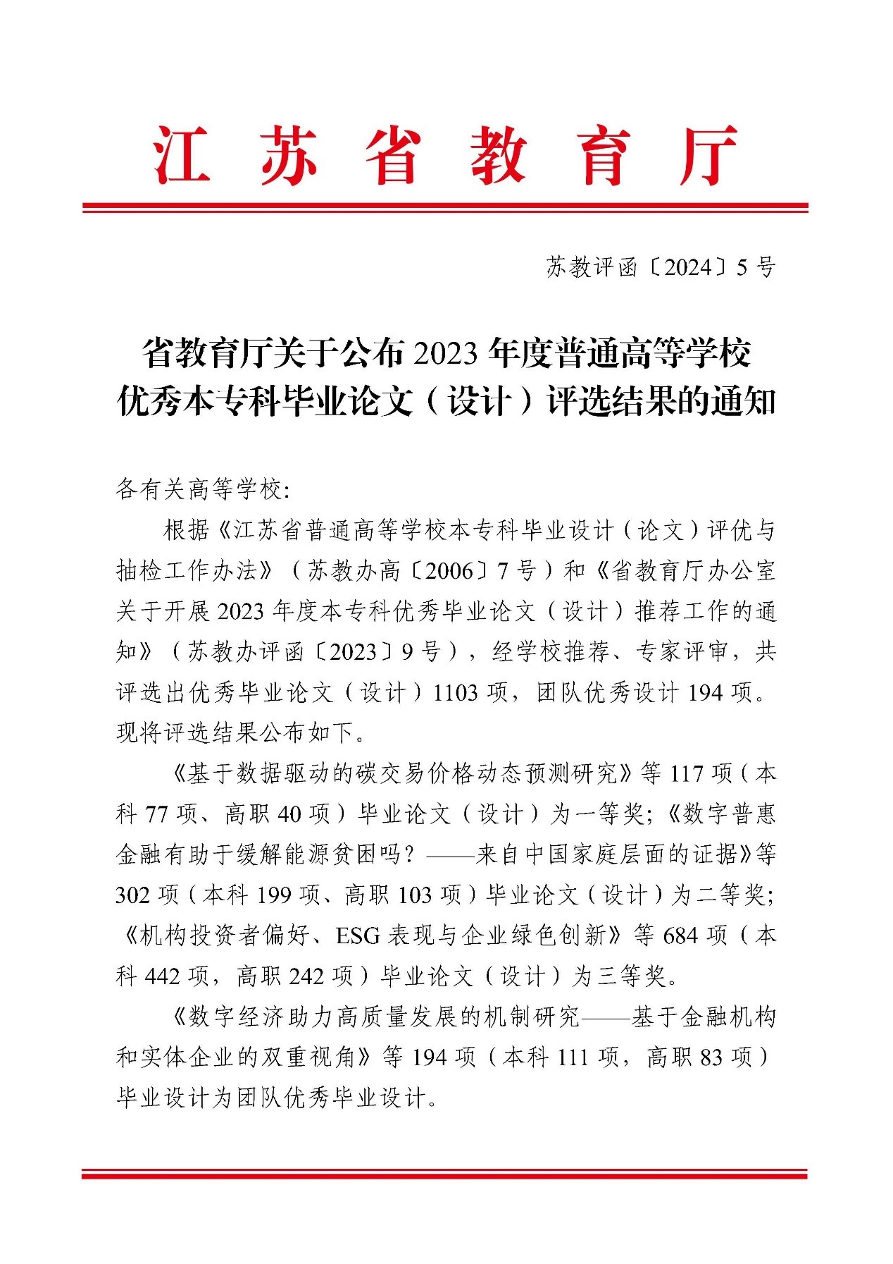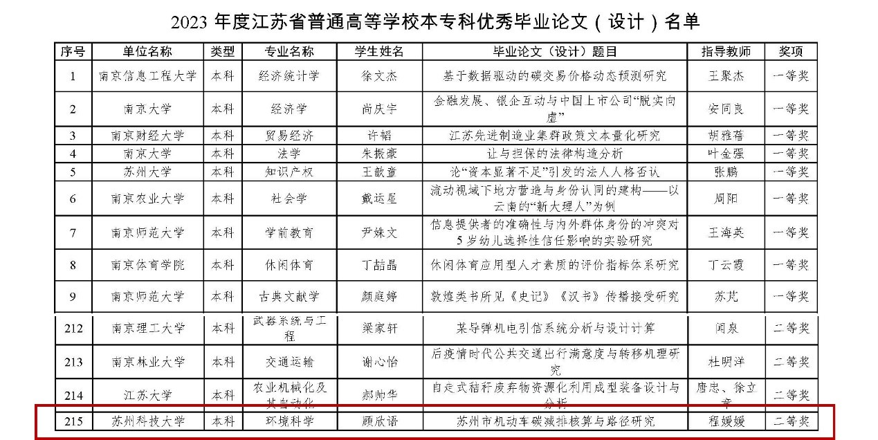 近日,江苏省省教育厅公布关于2023年度普通高等学校优秀本专科毕业论文(设计)评选结果的通知,由我院程媛媛教师指导、钱飞跃老师共同辅导的环境科学专业1912班顾欣语同学毕业论文《苏州市机动车碳减排核算与路径研究》获省优秀本科毕业设计(论文)二等奖。